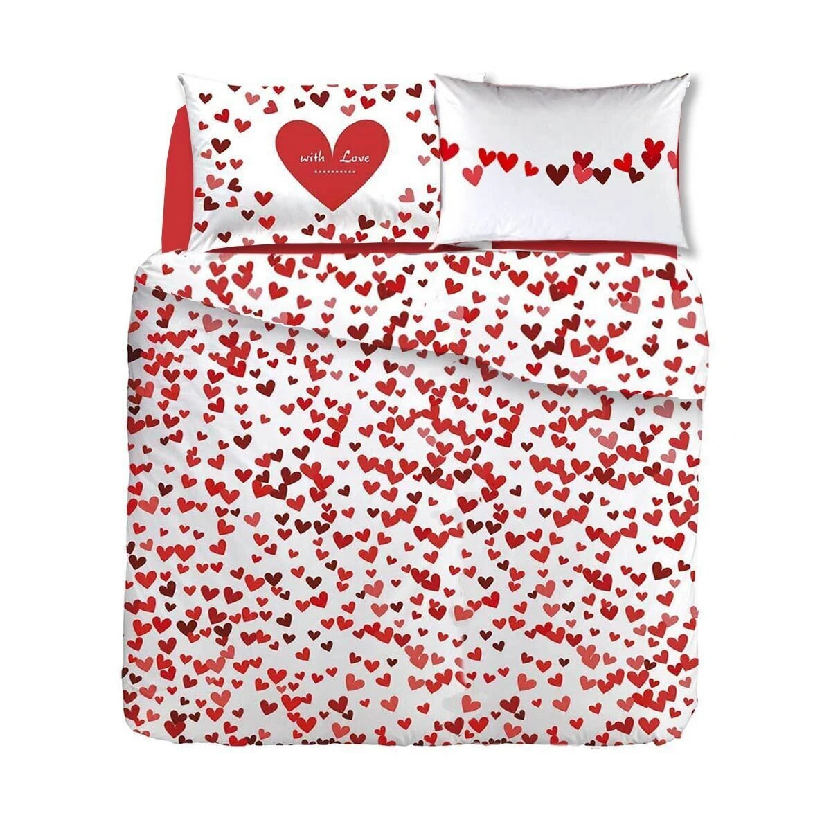 | Dettagli | La confezione contiene un completo copripiumino composto da: 1 sacco copripiumino 1 lenzuolo sotto con angoli Le dimensioni singola ed una piazza e mezza comprendono una federa, quella matrimoniale comprende due federe Stampa digitale con cuori Federe double face Romantico e originale Grande qualità inalterata nel tempo ECO COLOR coloranti ecologici certificati privi di sostanze nocive per l’uomo e l’ambiente Made in Italy |