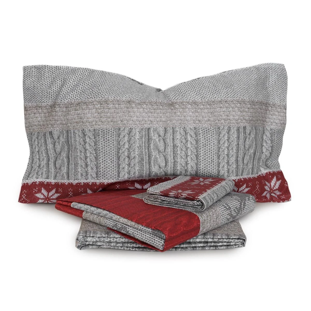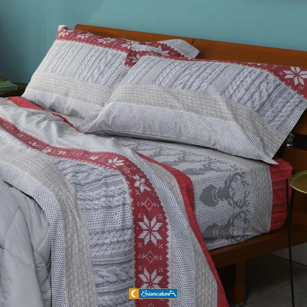 Il completo lenzuola Bald di Biancaluna realizzato in flanella di puro cotone, ha una stampa con motivo tricot ideale per l’inverno. Sarà come essere in una baita in montagna!