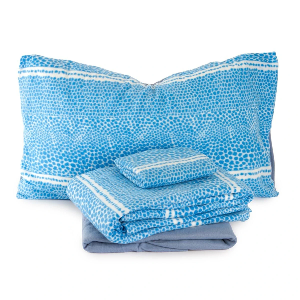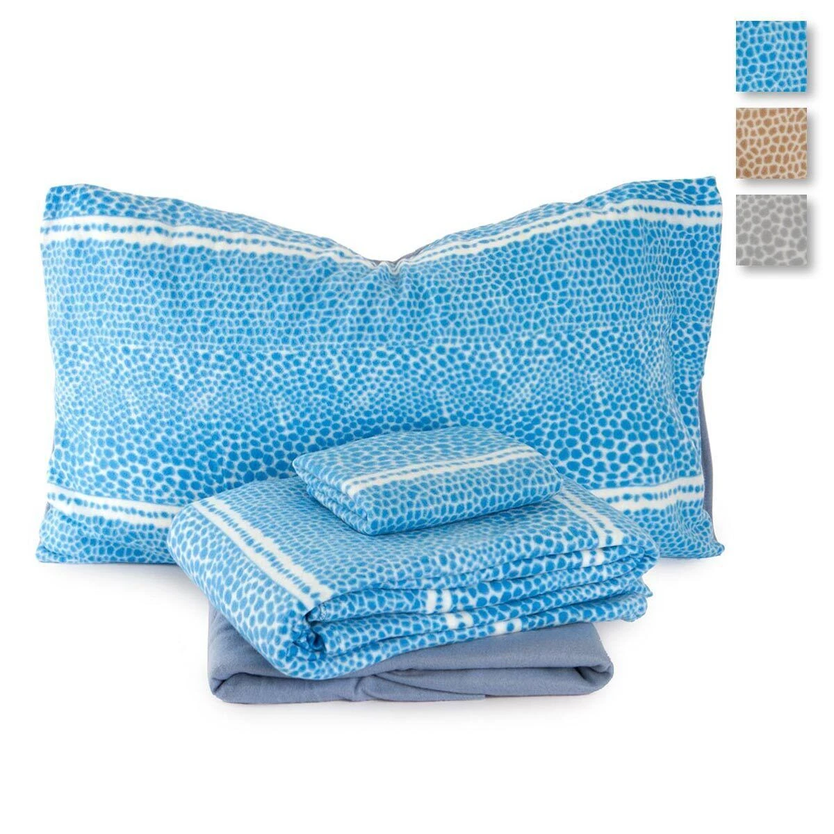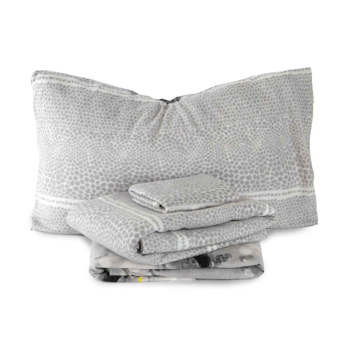 Morbido e caldo, questo completo letto in pile è l’ideale per l’inverno. Le lenzuola, grazie ai loro colori e al particolare motivo maculato, diventano anche un pezzo d’arredamento vivace per la casa.