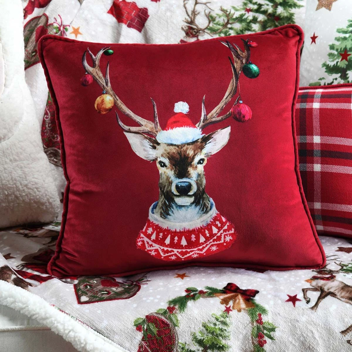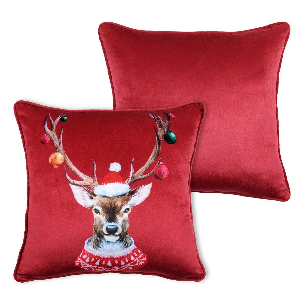 | Dettagli | La confezione contiene un cuscino arredo Forma quadrata Motivo natalizio Stampa di un cervo Retro in tinta unita rosso Bordino a coda di topo Sfoderabile, tramite cerniera Imbottitura inclusa |