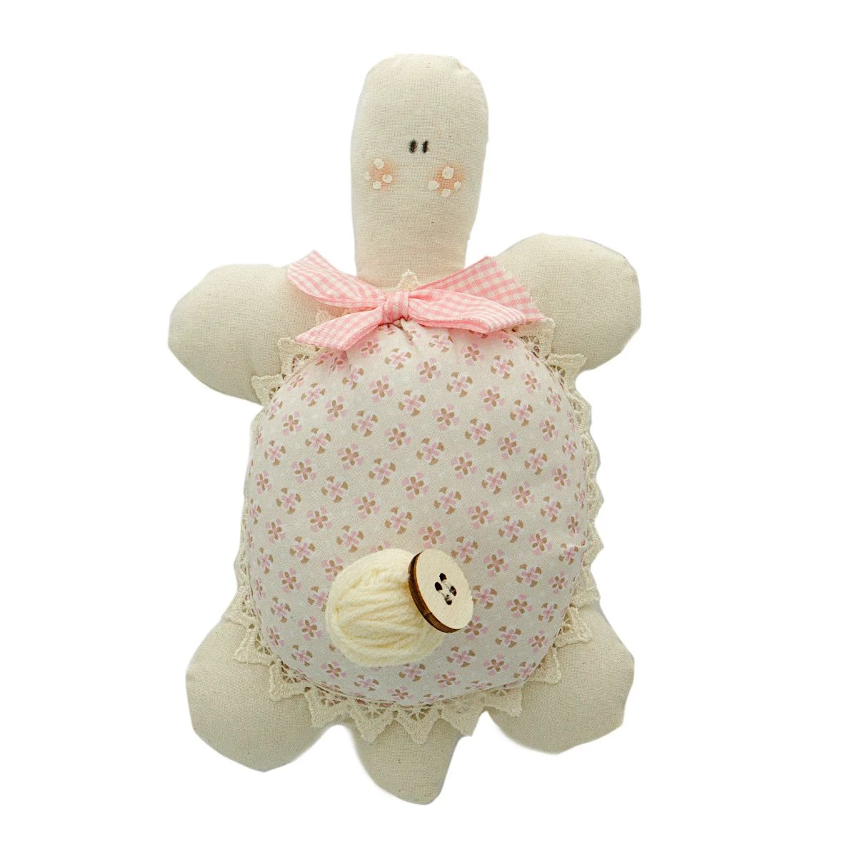| Dettagli | La confezione comprende un cuscino portaspilli a forma di Tartaruga realizzato con tessuto in cotone, imbottitura in soffice fibra di poliestere anallergica, merletto e fiocco rosa a quadretti. Inoltre, è completato da un piccolo gomitolo di lana ed un bottone di legno. Made in Italy |