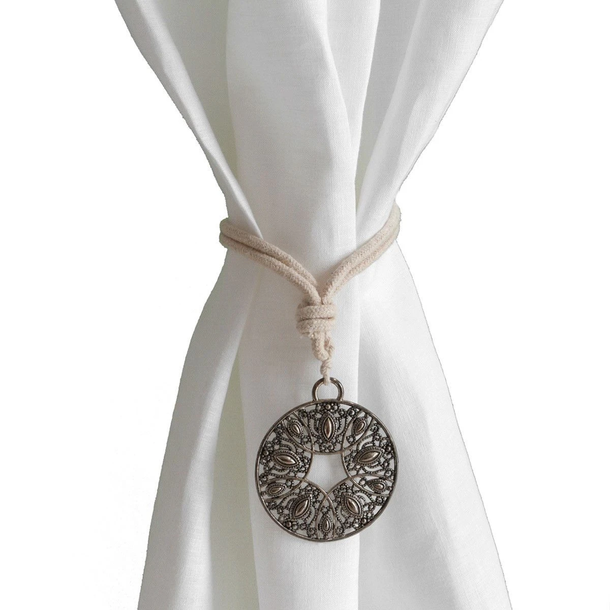 | Dettagli | La confezione contiene un fermatenda composto da: 1 nastro/laccio in corda intrecciata 1 decoro con medaglione in metallo lavorato Chiusura con asola |