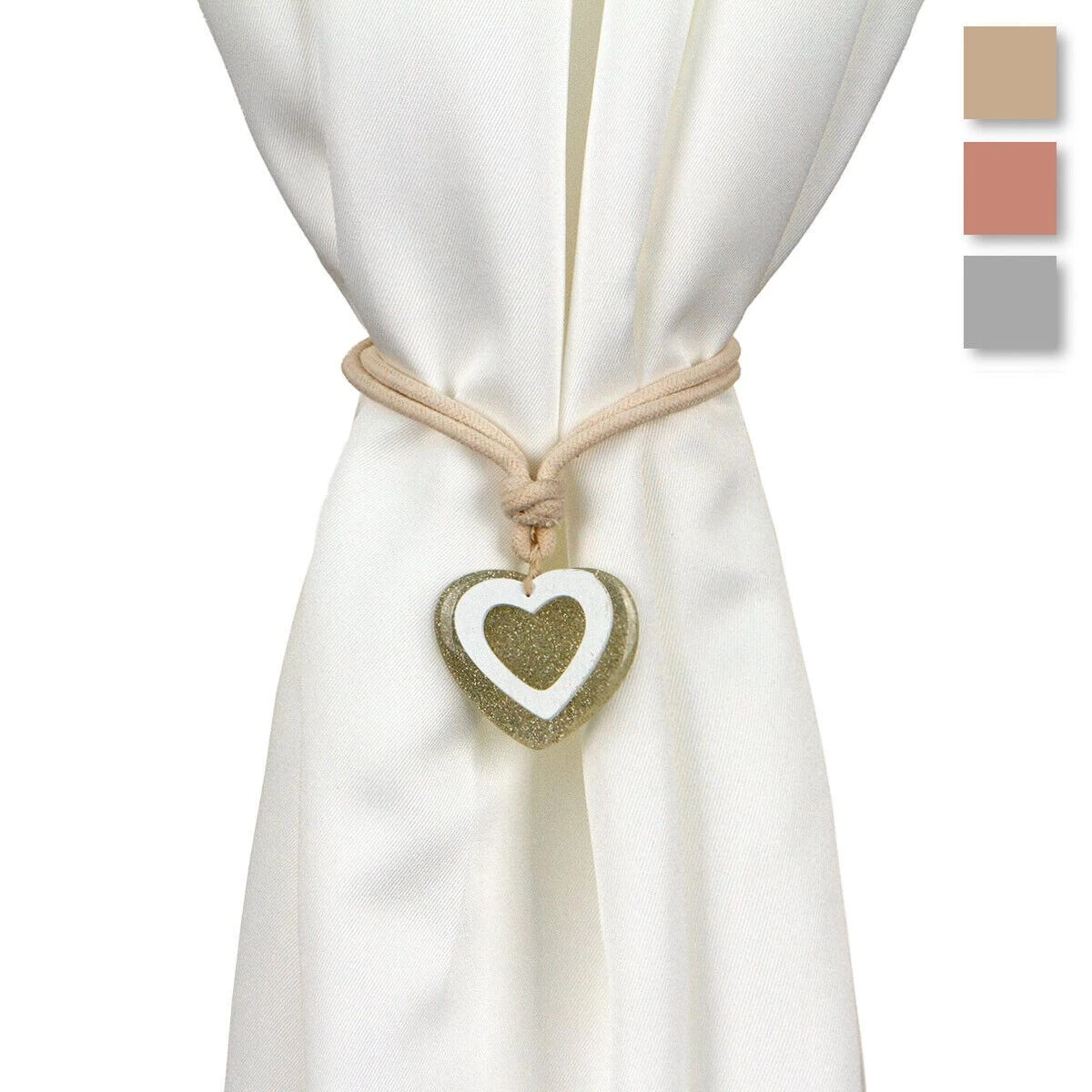 | Dettagli | La confezione contiene un fermatenda composto da: 1 nastro/laccio in corda intrecciata 1 decoro cuore in metallo con piccolo cuore sagomato in plastica trasparente Chiusura con asola Ideale per raccogliere le tende o creare drappeggi |