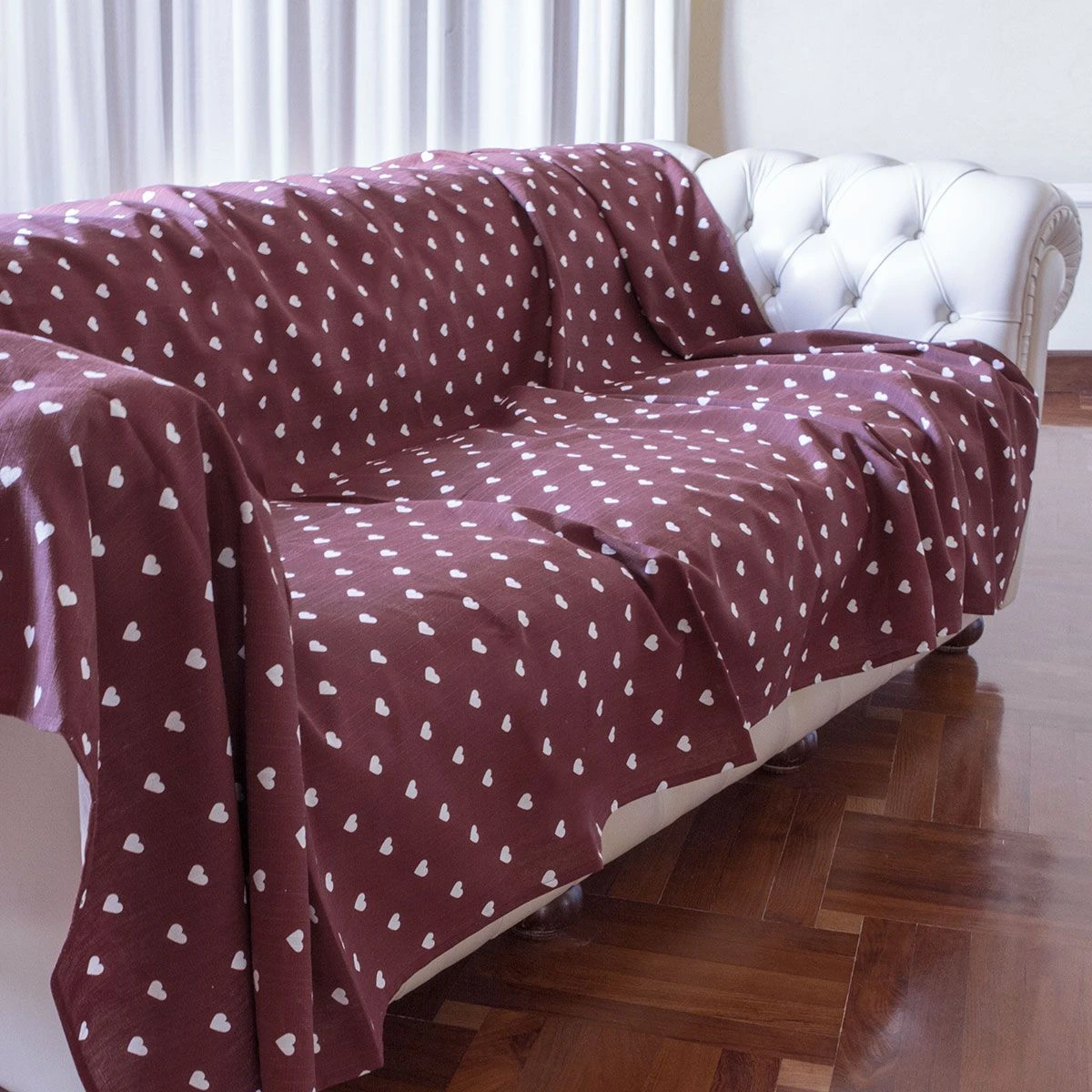Quando un ambiente ci stanca e vogliamo ridargli vita, non occorrono spese pazze per rivoluzionare tutto l’arredamento. I teli copritutto svolgono un valdio compito per aiutarci in questo progetto. Il foulard arredo Cuori con fondo in tinta unita e disegno in contrasto di colore, si abbina ad un arredamento caldo ed accogliente. Romantico.