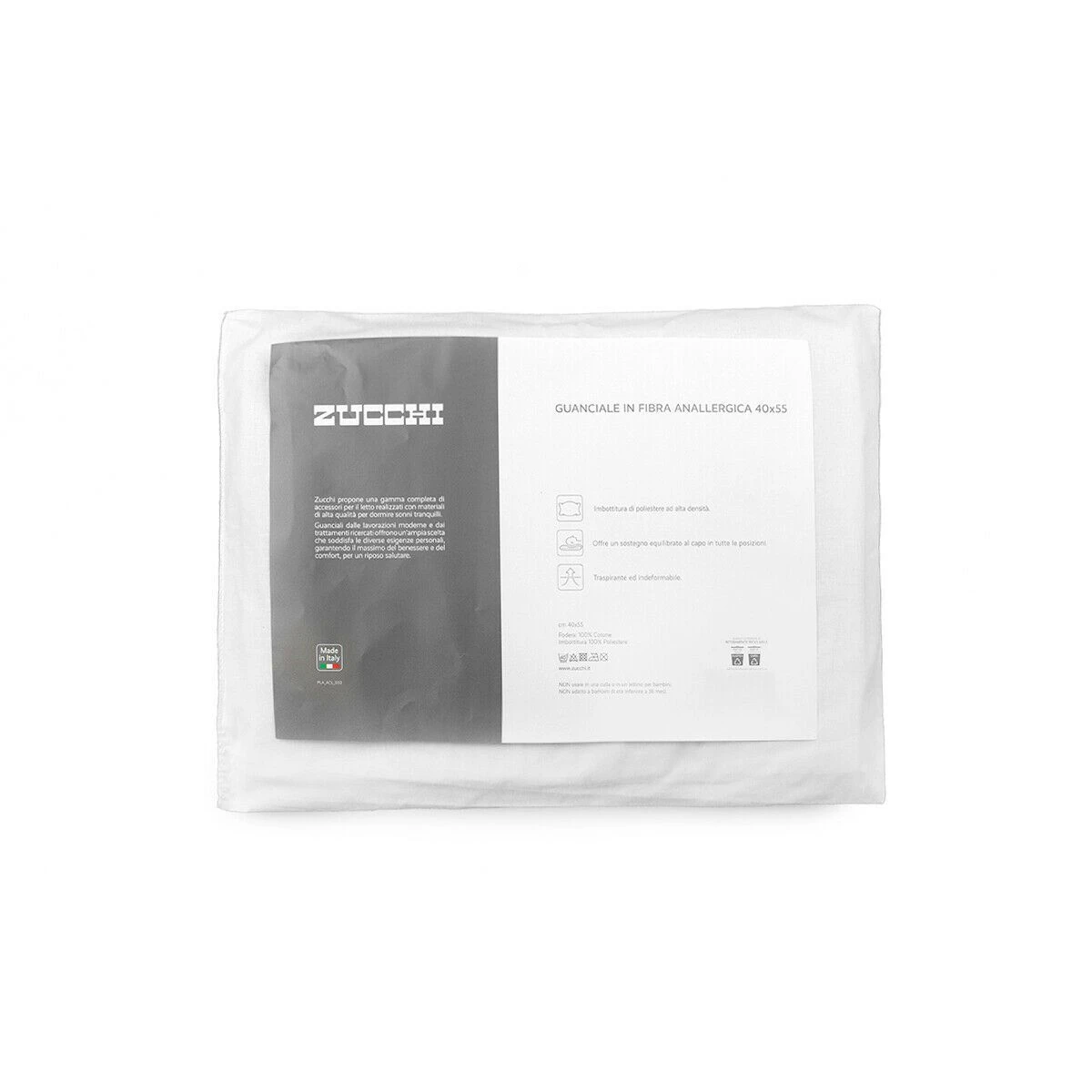 Il guanciale in fibra anallergica firmato zucchi è realizzato con un’imbottitura in poliestere ad alta densità, perfetta per garantire grande comfort nel momento del riposo e capace di adattarsi alle forme del capo in qualsiasi posizione.