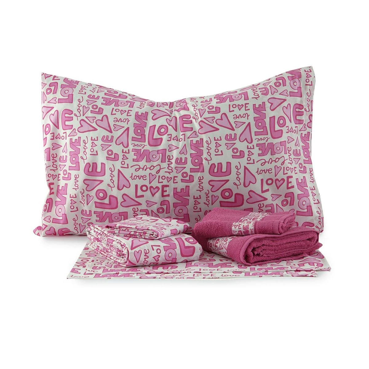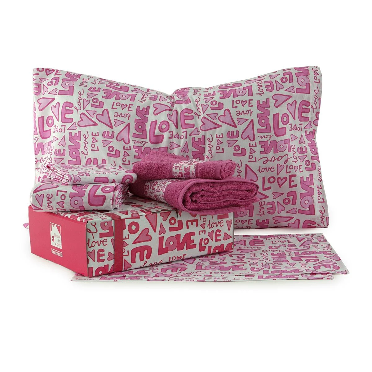 | Dettagli | La confezione contiene: 1 parure letto composta da una federa ed un lenzuolo sopra 2 tovagliette all’americana 1 set asciugamani bagno in morbida spugna (asciugamano medio + ospite) 1 profuma biancheria Fantasia con cuori e scritte Love Gli articoli sono confezionati all’interno di una simpatica scatola colorata Ottima idea regalo Designed in Italy Made in Italy |