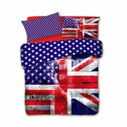 | Dettagli | La confezione contiene una parure copripiumino composta da: 1 sacco copripiumino 2 federe a sacchetto Sacco e federe stampate Stampa piazzata con motivo della bandiera americana ed inglese Fibra naturale di puro cotone Lavare i colori separatamente |