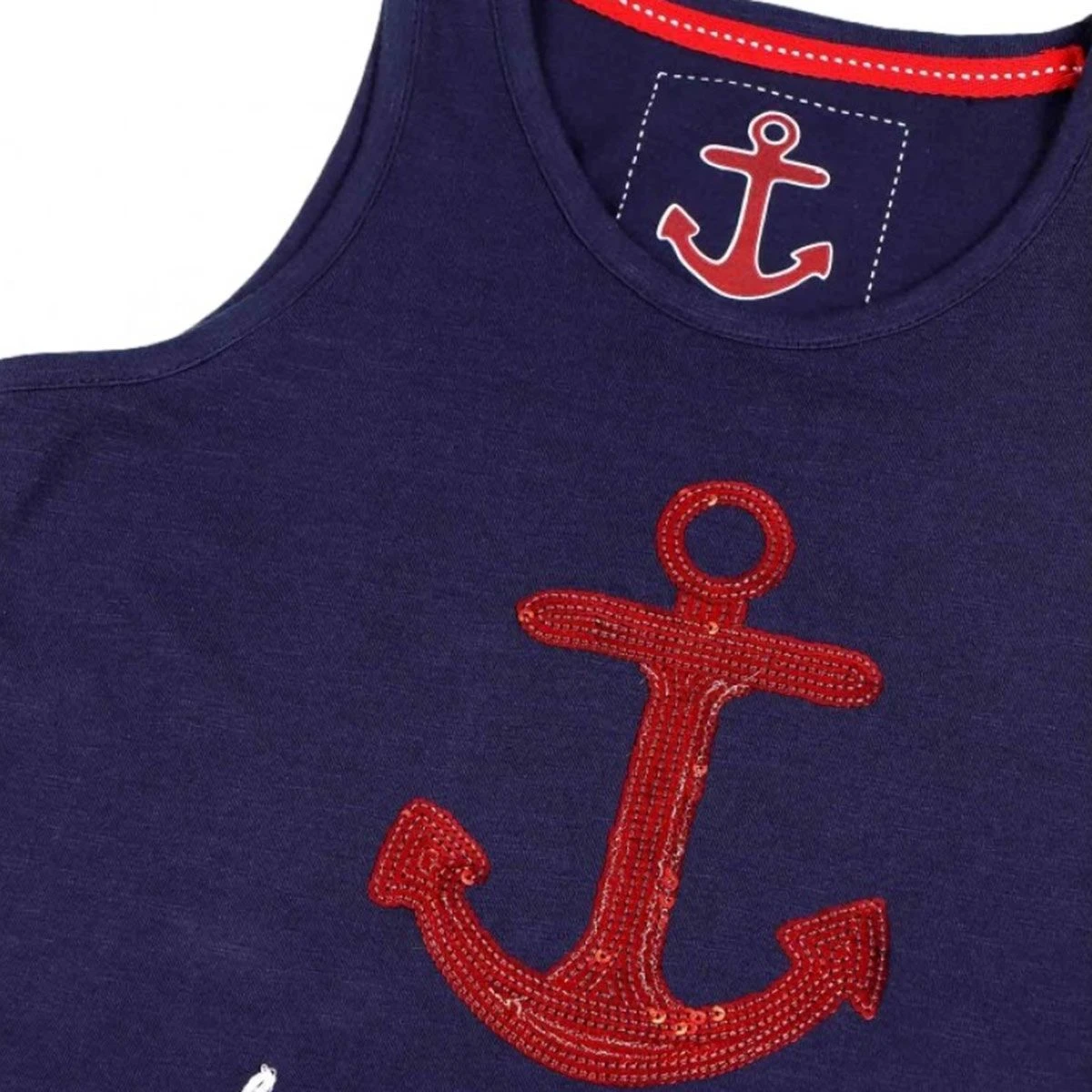 | Dettagli | La confezione contiene un pigiama per bambina/ragazza estivo composto da: 1 canotta spalla larga girocollo con stampa centrale con paillettes di un’ancora e scritta “la vie est belle” ricamata 1 pantaloncino corto motivo marino con ancore con elastico in vita Cotone jersey, fresco e leggero Confezionato in una scatola stampata |
