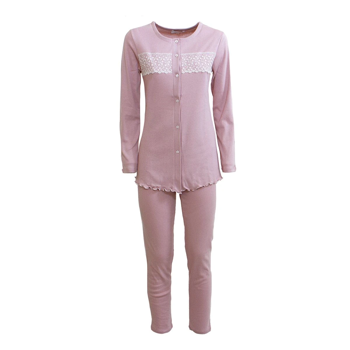 | Dettagli | La confezione contiene un pigiama da donna in caldo cotone che comprende Una maglia aperta avanti con bottoni Un pantalone in tinta unita Applicazione di merletto in contrasto di colore sul petto Estremità maglia smerlata Ideale anche per l’allattamento Il prodotto è confezionato in scatola Made in Italy |