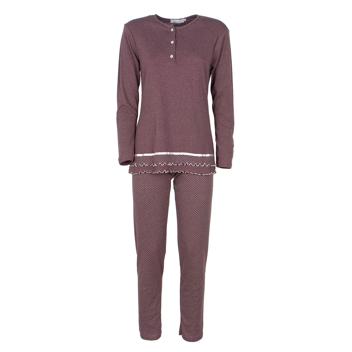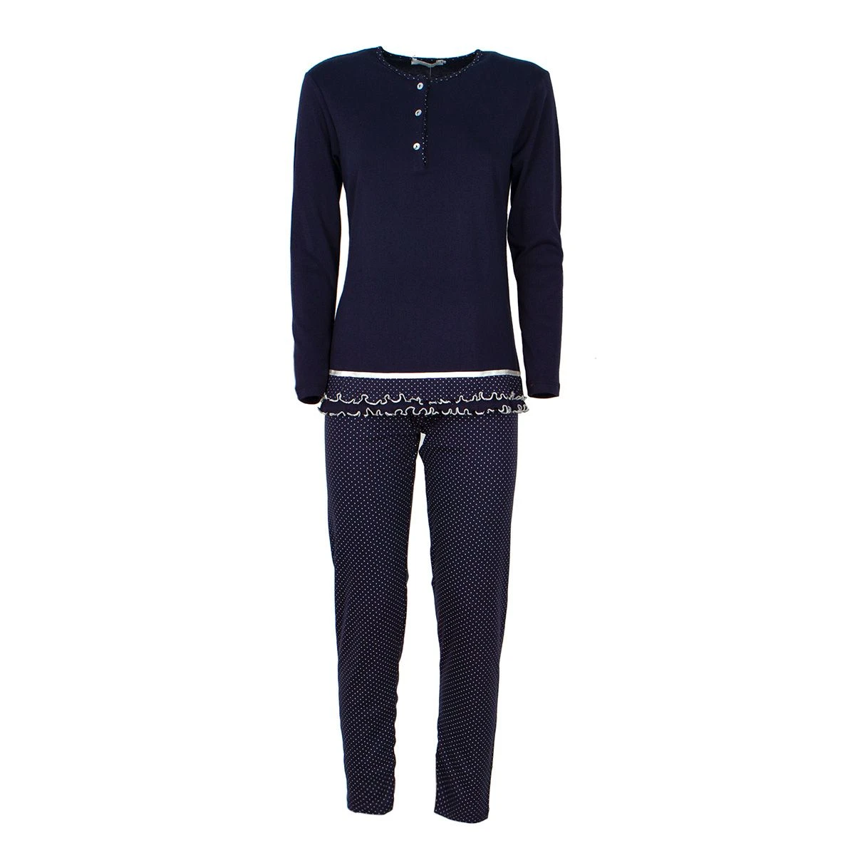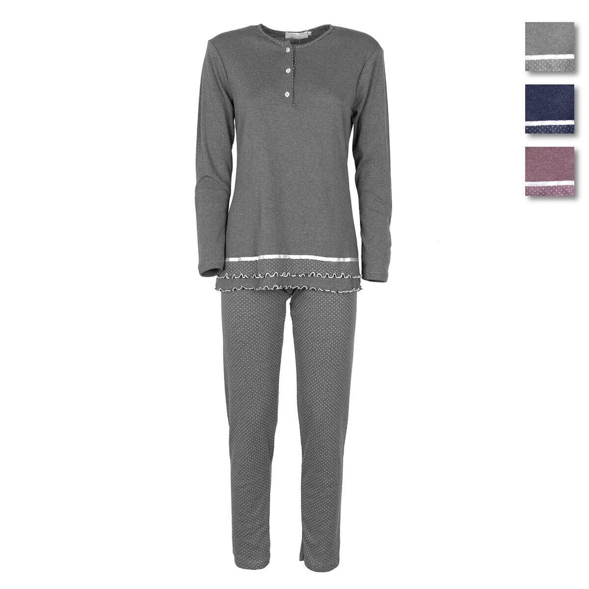 | Dettagli | La confezione contiene un pigiama donna taglie forti in caldo cotone composto da: Una maglia a manica lunga girocollo serafino con apertura lunga a 4 bottoni Un pantalone lungo in micro pois con elastico in vita Estremità maglia smerlata Morbido e soffice caldo cotone Il prodotto è confezionato in scatola Made in Italy |