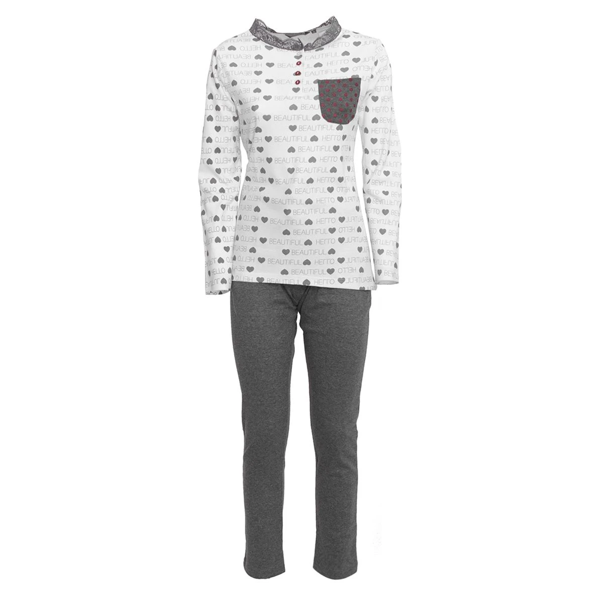 | Dettagli | La confezione contiene un pigiama da donna in caldo cotone composto da: 1 maglia scollo serafino, taschino laterale e stampa con cuori e scritte 1 pantalone lungo tinta unita, laccio regolabile e d elastico in vita Filati di qualità nel rispetto della natura Morbido e soffice caldo cotone Ideale per il periodo invernale Confezionato in una scatola stampata |