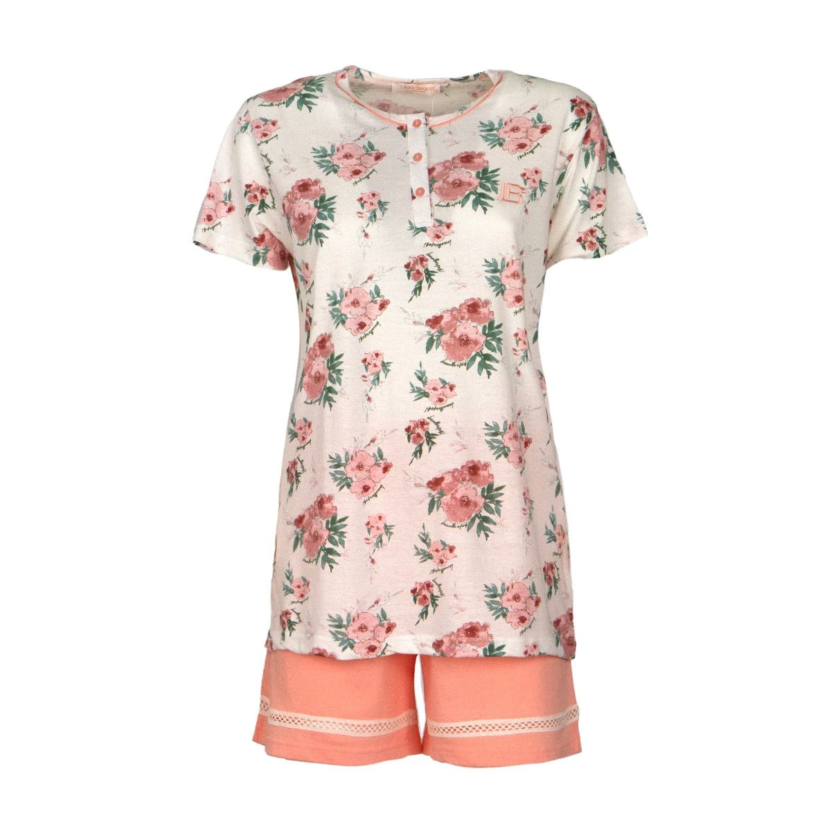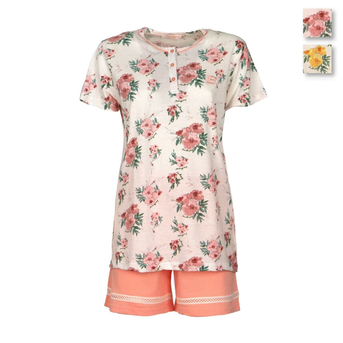 | Dettagli | La confezione contiene un pigiama da donna composto da: 1 maglia a mezza manica con girocollo serafino con 3 bottoncini 1 pantaloncino corto tinta unita con elastico in vita Maglia con motivo floreale e dettaglio ricamato Jersey di cotone, fresco e leggero Confezionato in una scatola stampata Styled in Italy |