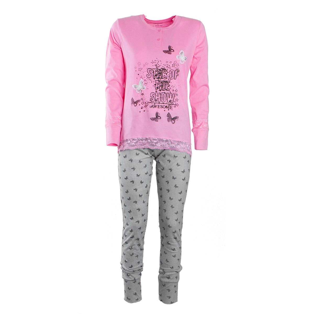 | Dettagli | La confezione contiene un pigiama da donna composto da: 1 maglia a manica lunga scollo serafino con bottoncini madreperlati 1 pantalone lungo stampato con elastico in vita e polsini Preziosi inserti in pizzo Jersey di cotone, fresco e leggero Adatto per la primavera, l’estate e l’autunno Confezionato in una scatola stampata |