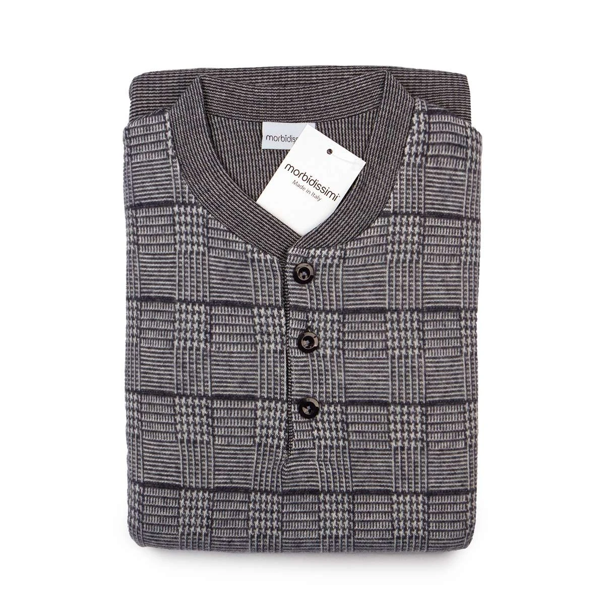 | Dettagli | La confezione contiene un pigiama invernale da uomo composto da: 1 maglia con scollo serafino, bottoncini e stampa a quadretti 1 pantalone lungo trama geometrica con elastico in vita e polsini Morbido e soffice punto milano Ideale per il periodo invernale Made in Italy |