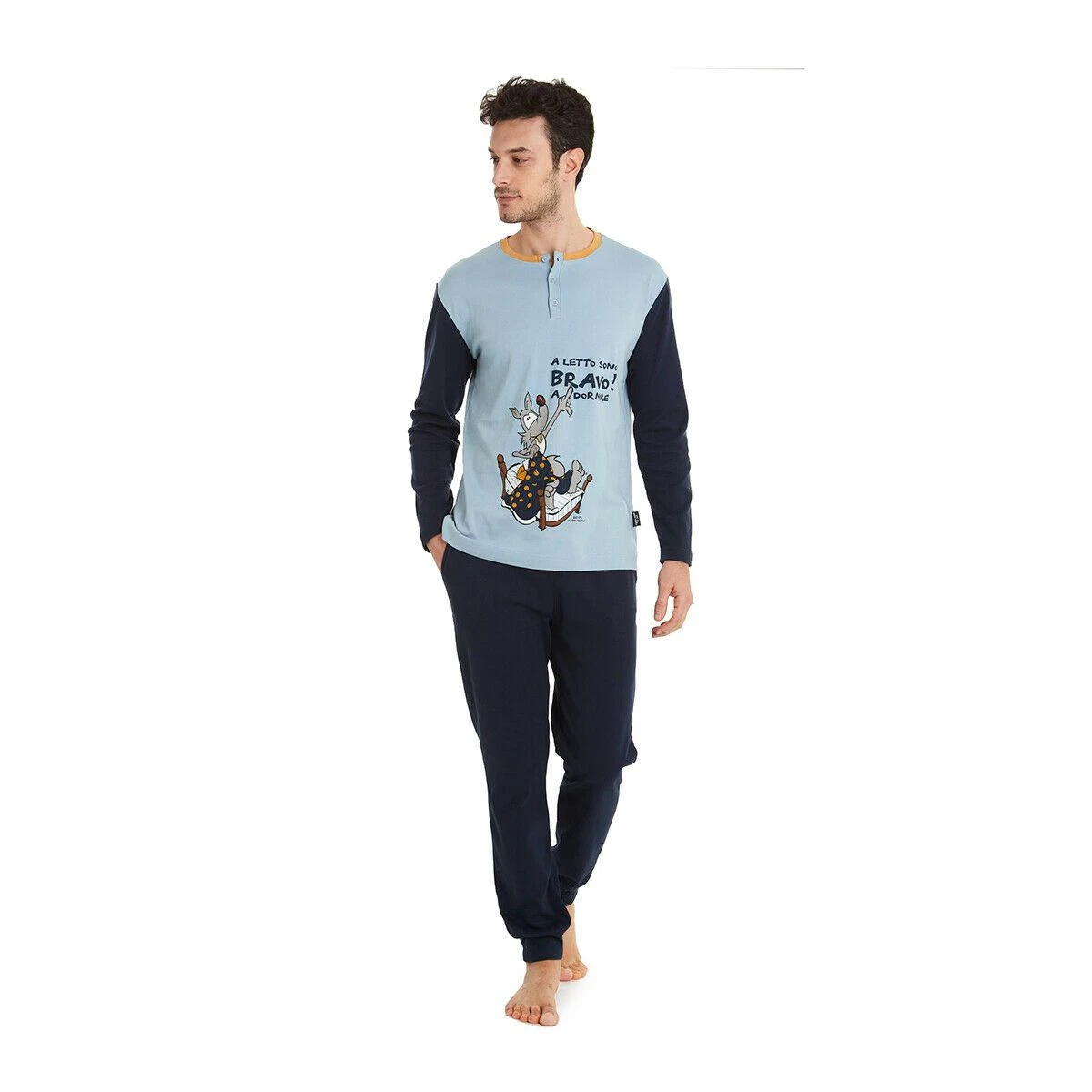 | Dettagli | La confezione contiene un pigiama per uomo composto da: 1 maglia manica lunga scollo serafino e stampa centrale, con polsini 1 pantalone lungo tinta unita, elastico in vita e polsini Comodo e pratico Caldo e soffice cotone Ideale per il periodo invernale |