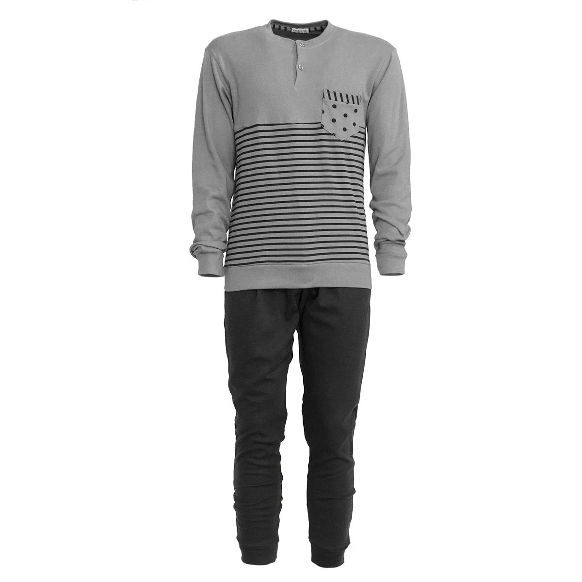 | Dettagli | La confezione contiene un pigiama da uomo composto da: 1 maglia a manica lunga girocollo serafino, comodi polsini elasticizzati e taschino 1 pantalone lungo a tinta unitacon elastico in vita e polsini elasticizzati Morbido e soffice caldo cotone Adatto anche per stare in casa Ideale per il periodo invernale Confezionato in una scatola stampata |