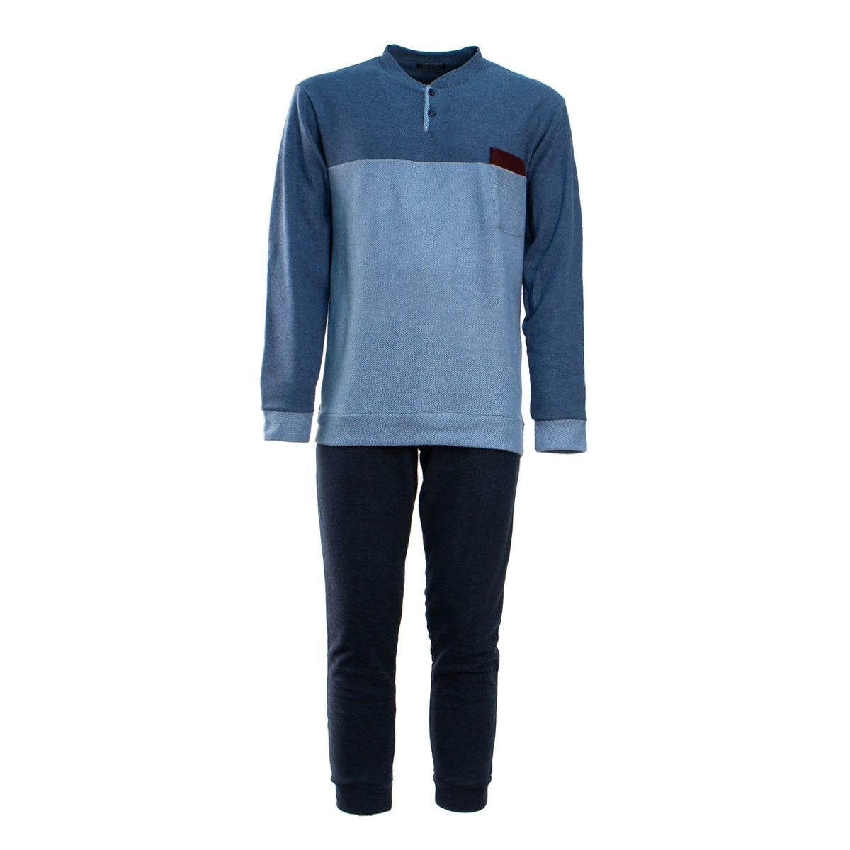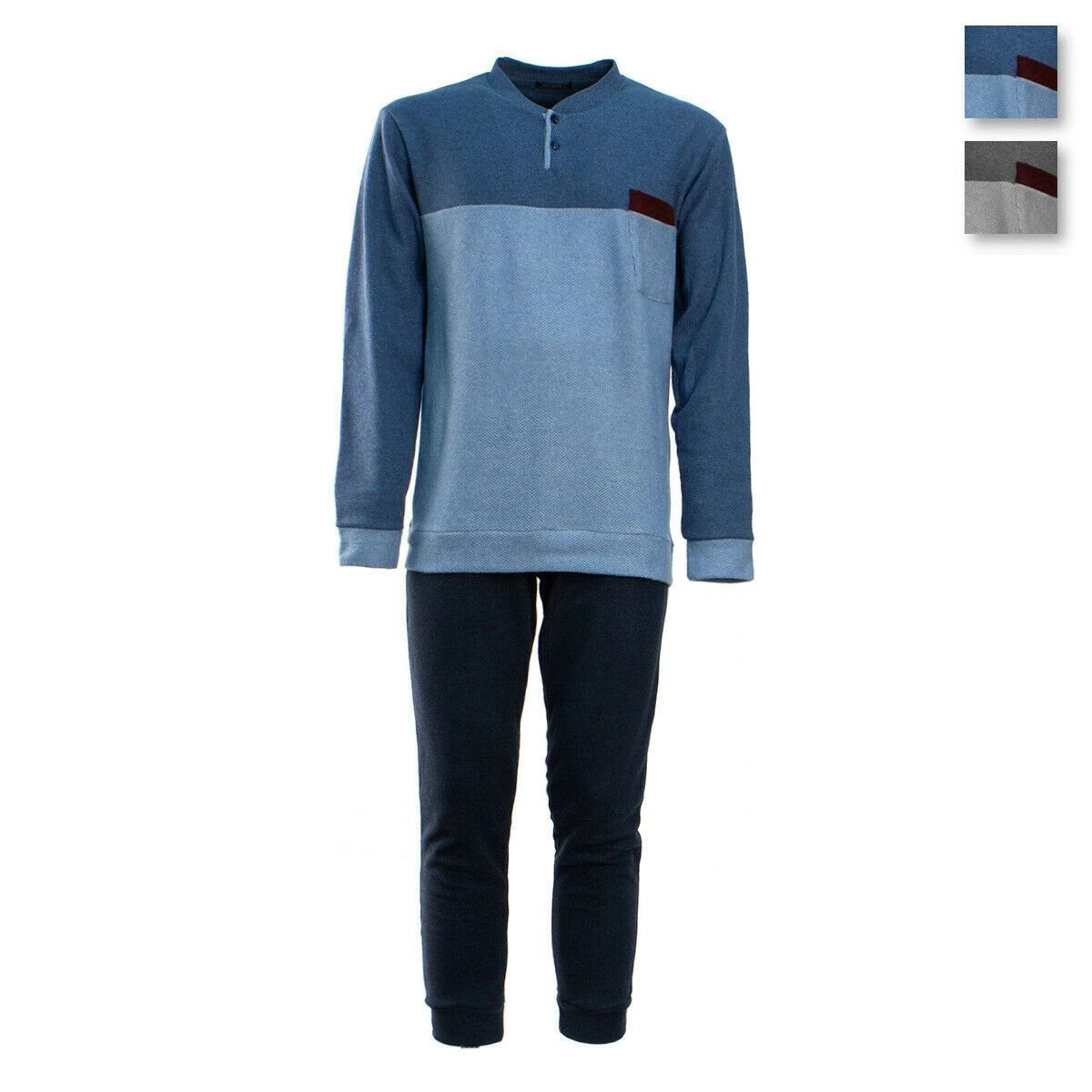 | Dettagli | La confezione contiene un pigiama da uomo composto da: 1 maglia con scollo serafino e polsini elasticizzati sia al bordo che alle maniche, taschino altezza petto 1 pantalone tinta unita con elastico in vita, polsini elasticizzati e taschino posteriore Maglia bicolor, pantaloni in tinta unita Morbido e caldo punto milano, ideale per il periodo invernale Confezionato in una scatola stampata |