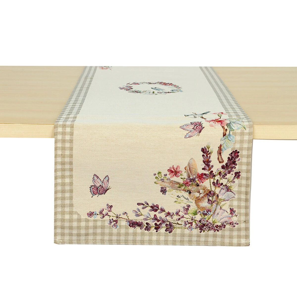 Il coniglio è il più classico simbolo della Pasqua. E’ rappresentato su questo runner centrotavola conferendogli un perfetto tema pasquale. Il tessuto è solido e resistente, interamente Made in Italy