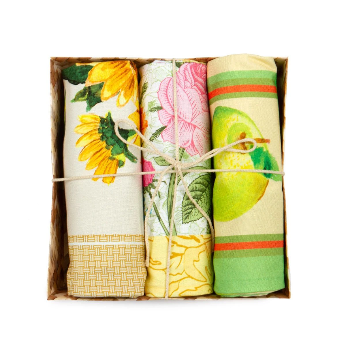 | Dettagli | La confezione contiene un set da 3 strofinacci da cucina Forma rettangolare Stampa digitale con fiori, differente per ciascun canovaccio Bordo con motivo a quadri di colore differente per ciascun canovaccio Puro cotone, resistente ai numerosi lavaggi Confezionato in una scatola stampata |