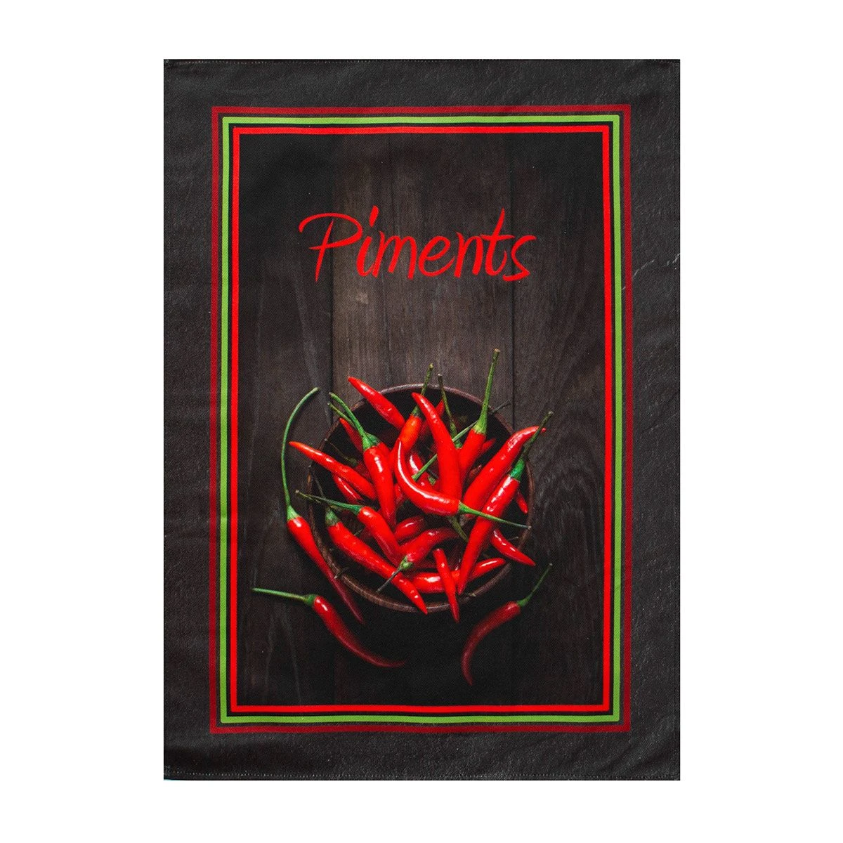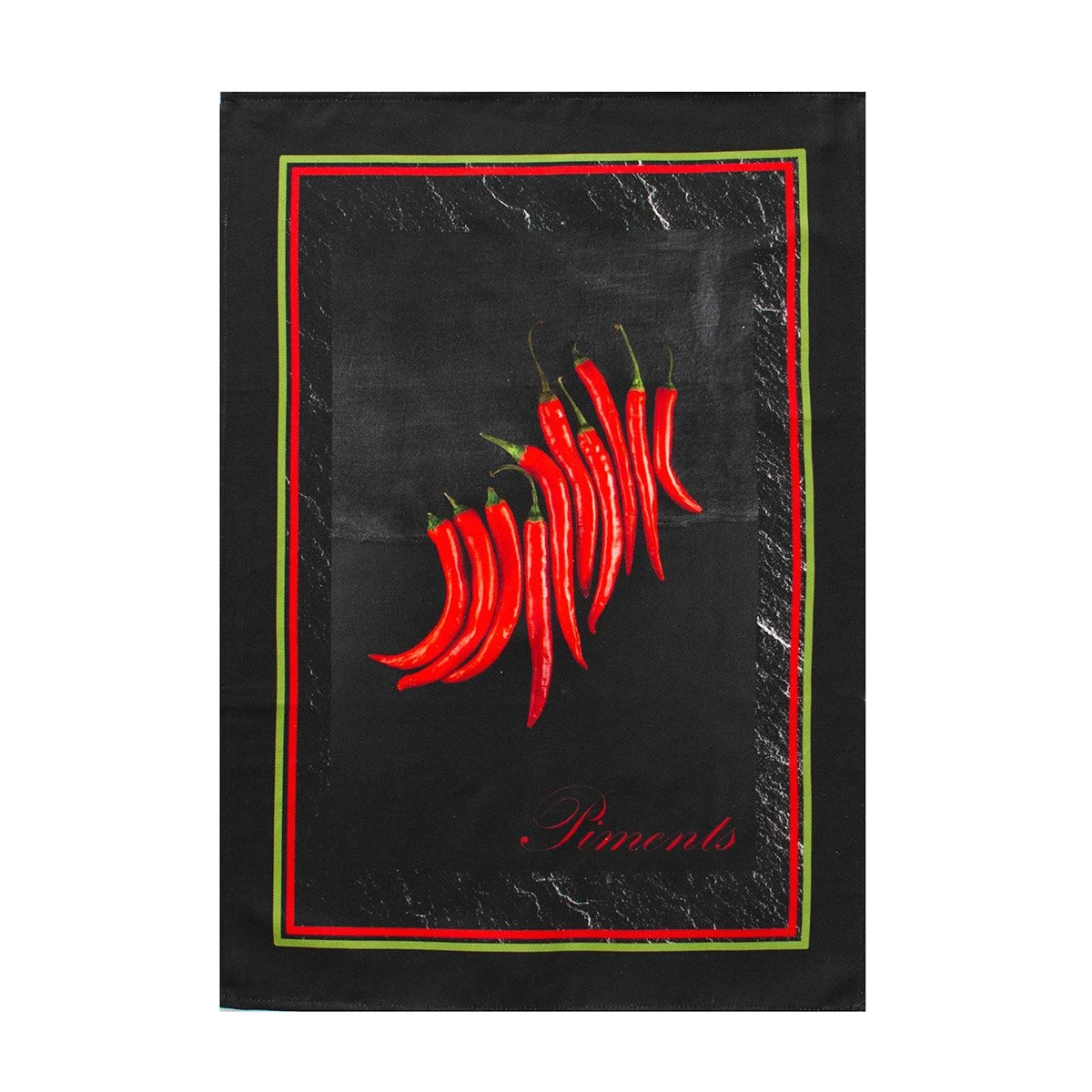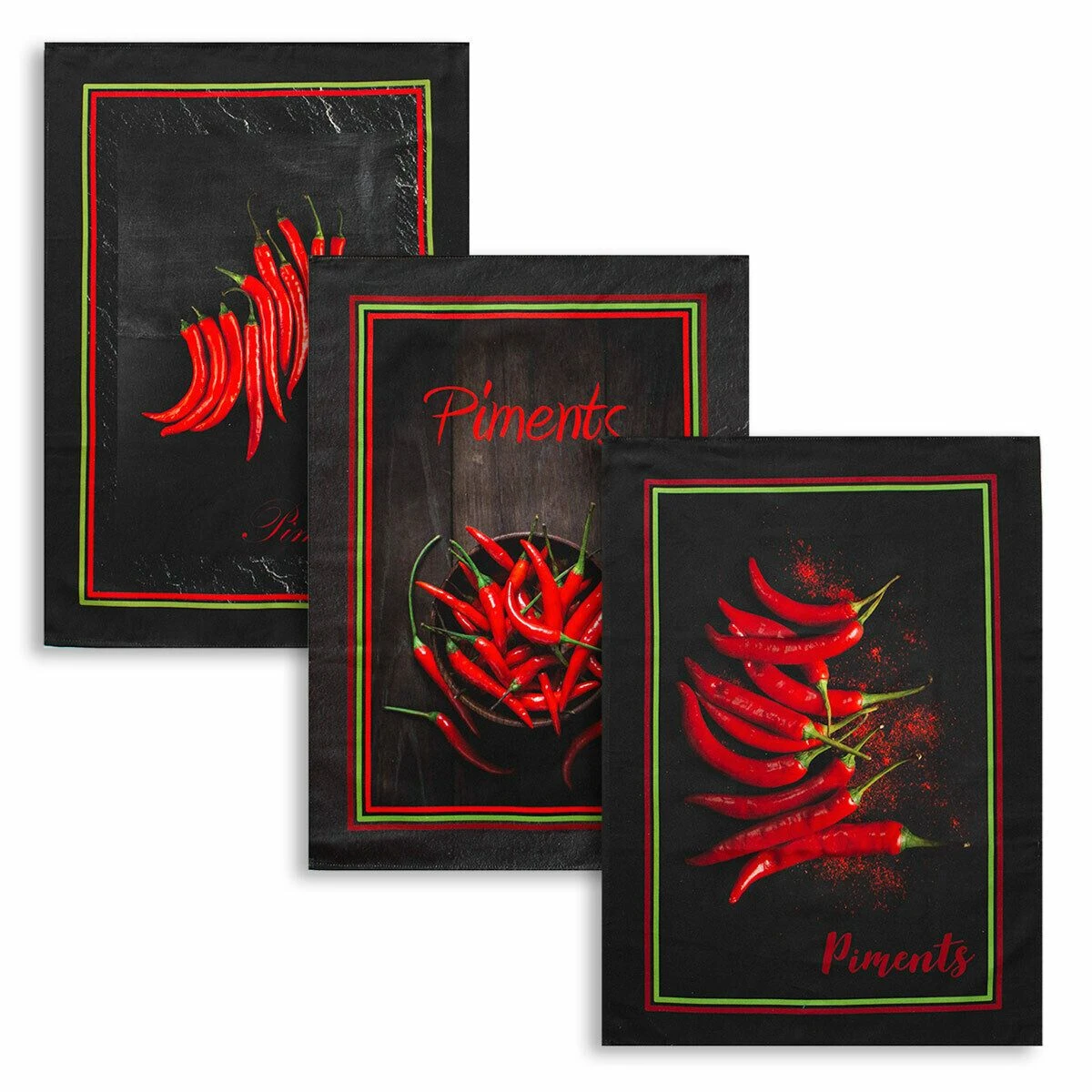 | Dettagli | La confezione contiene un set composto da 3 canovacci Forma rettangolare Stampa di peperoncini rossi Fantasia differente per ciascun canovaccio Retro in tinta unita Appendino nascosto, posto nell’angolo posteriore Utilizzabile come canovacci e asciugapiatti |