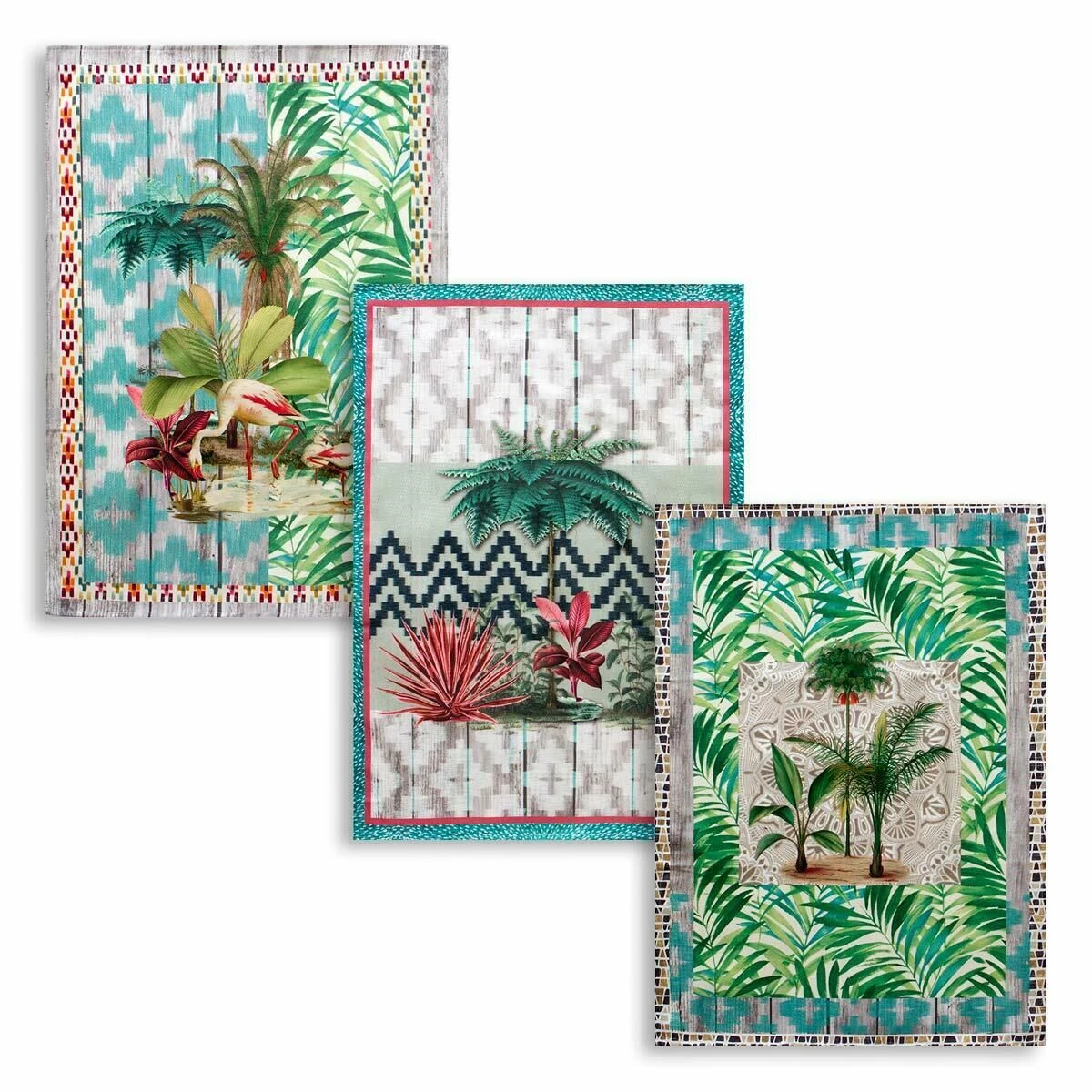 | Dettagli | La confezione contiene un set composto da 3 canovacci Forma rettangolare Stampa multicolore Fantasia differente per ogni canovaccio Retro in tinta unita Appendino nascosto, posto nell’angolo posteriore Utilizzabile come canovacci e asciugapiatti |