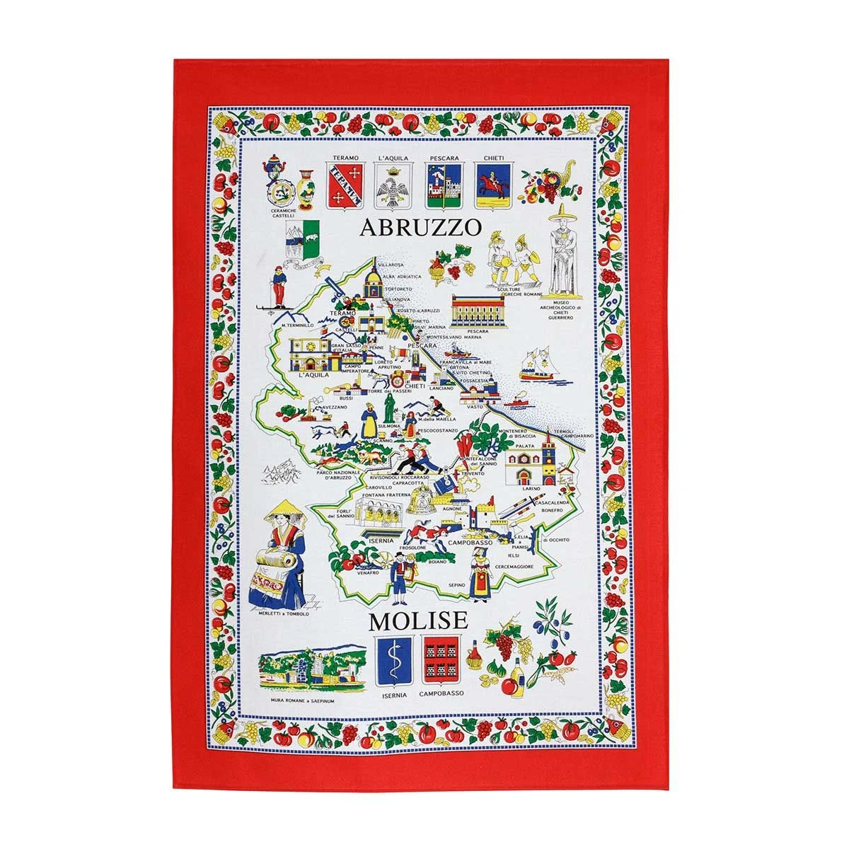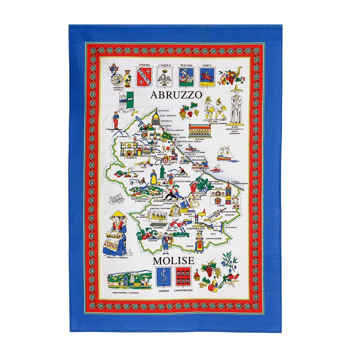 | Dettagli | La confezione contiene uno strofinaccio da cucina Forma rettangolare Stampa della mappa dell’Abruzzo con le sue città e le sue usanze Bordo perimetrale in contrasto di colore Retro in tinta unita Colori solidi al lavaggio Puro cotone di elevata qualità, compatto e resistente Made in Italy |