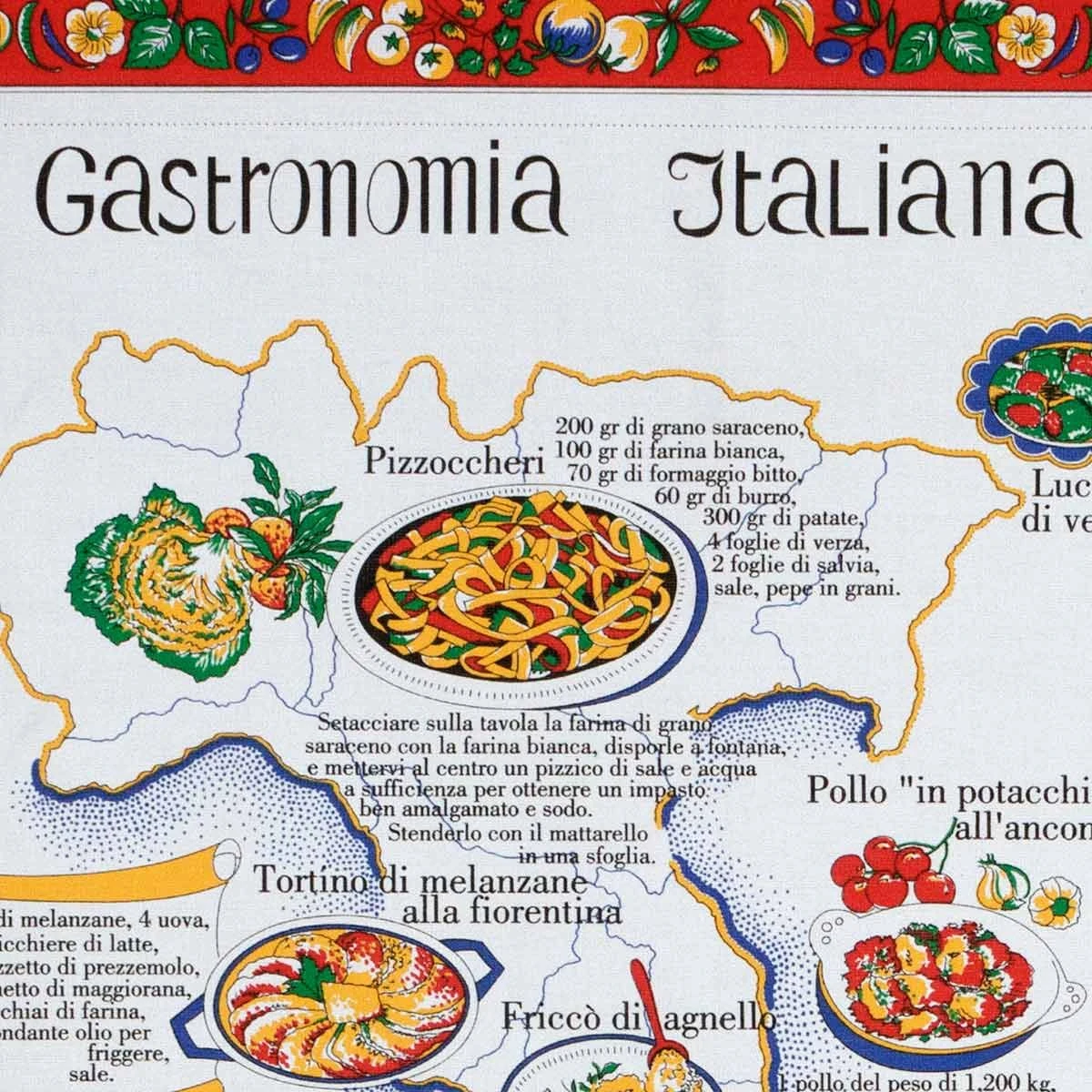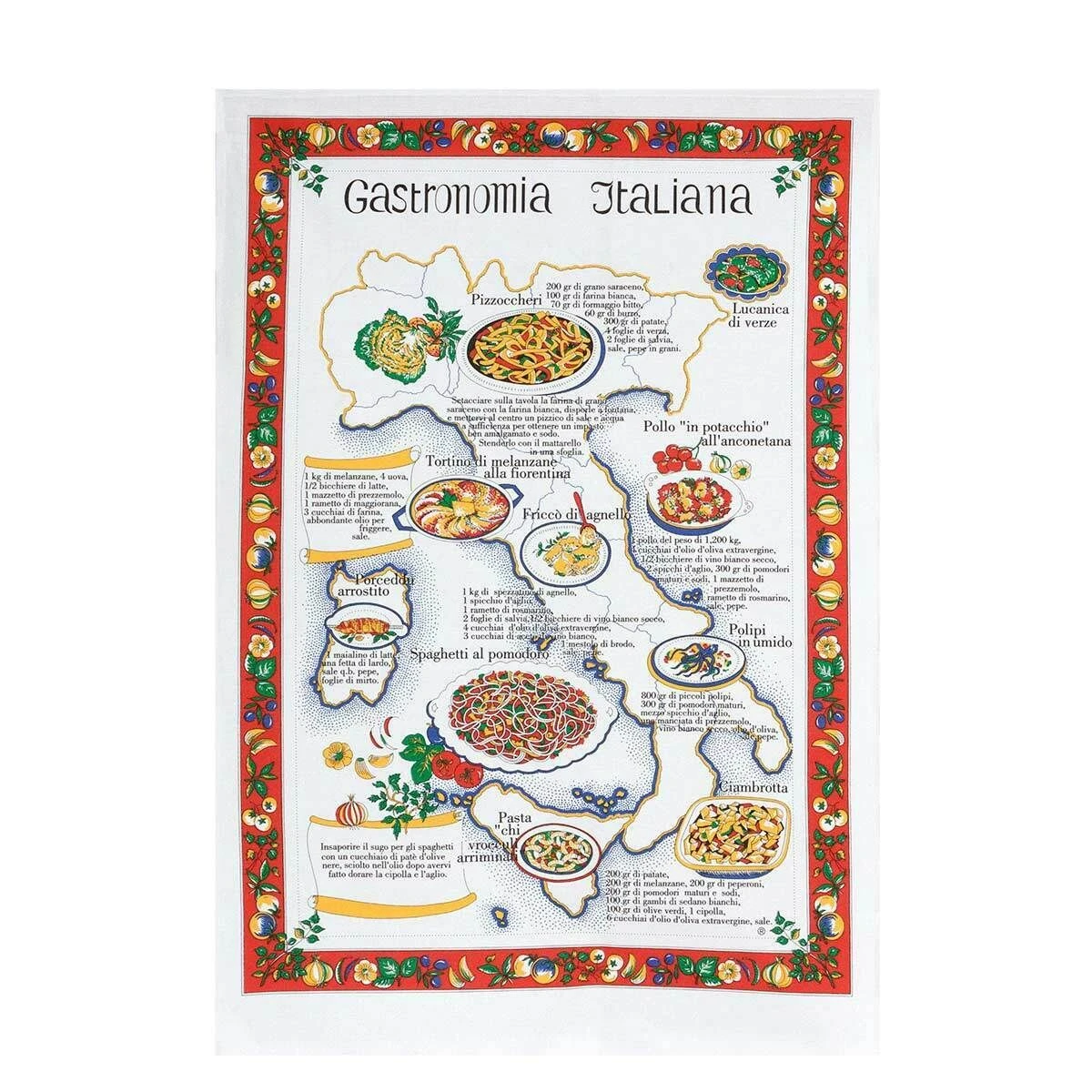 Cosa si mangia di buono in Piemonte, in Puglia, in Campania e in altre regioni? Queste e tante altre curiosità potranno essere soddisfatte con lo strofinaccio da cucina Gastronomia Italiana.