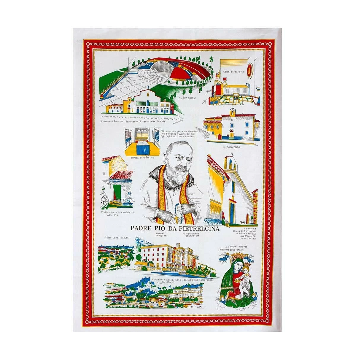Questo particolare strofinaccio raffigura Padre pio e tutti gli aspetti più importanti della sua vita. Realizzato interamente in cotone.