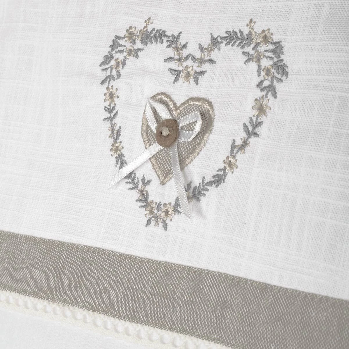 | Dettagli | La confezione contiene una tendina a vetro Stile shabby, country e romantico con cuore ricamato centralmente Superiormente fascia di tessuto effetto lino in contrasto di colore, inferiormente tessuto simil-velo trasparente ideale per lasciar passare molta luce nell’ambiente Nappa decorativa posti alla base e inserto superiore in passamaneria Dotata di passanti in cui va inserito il bastoncino Pronta per essere montata Coordinabile con altri articoli |